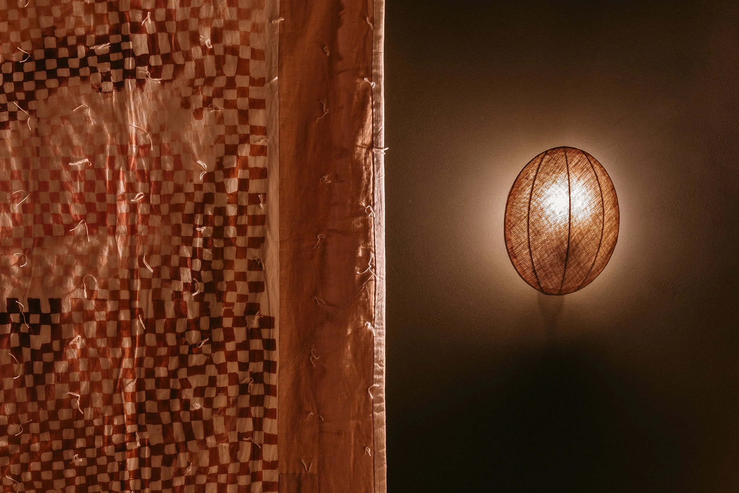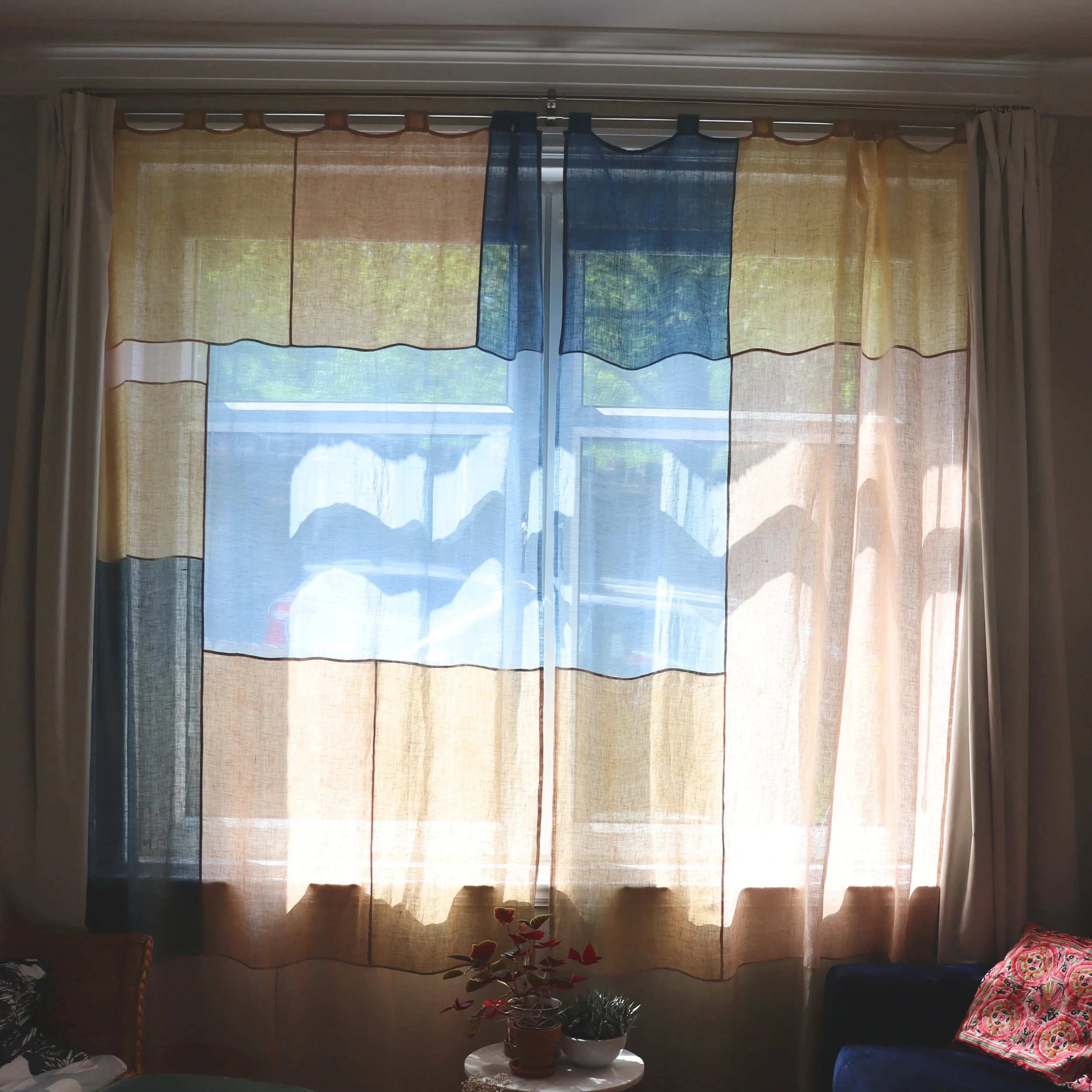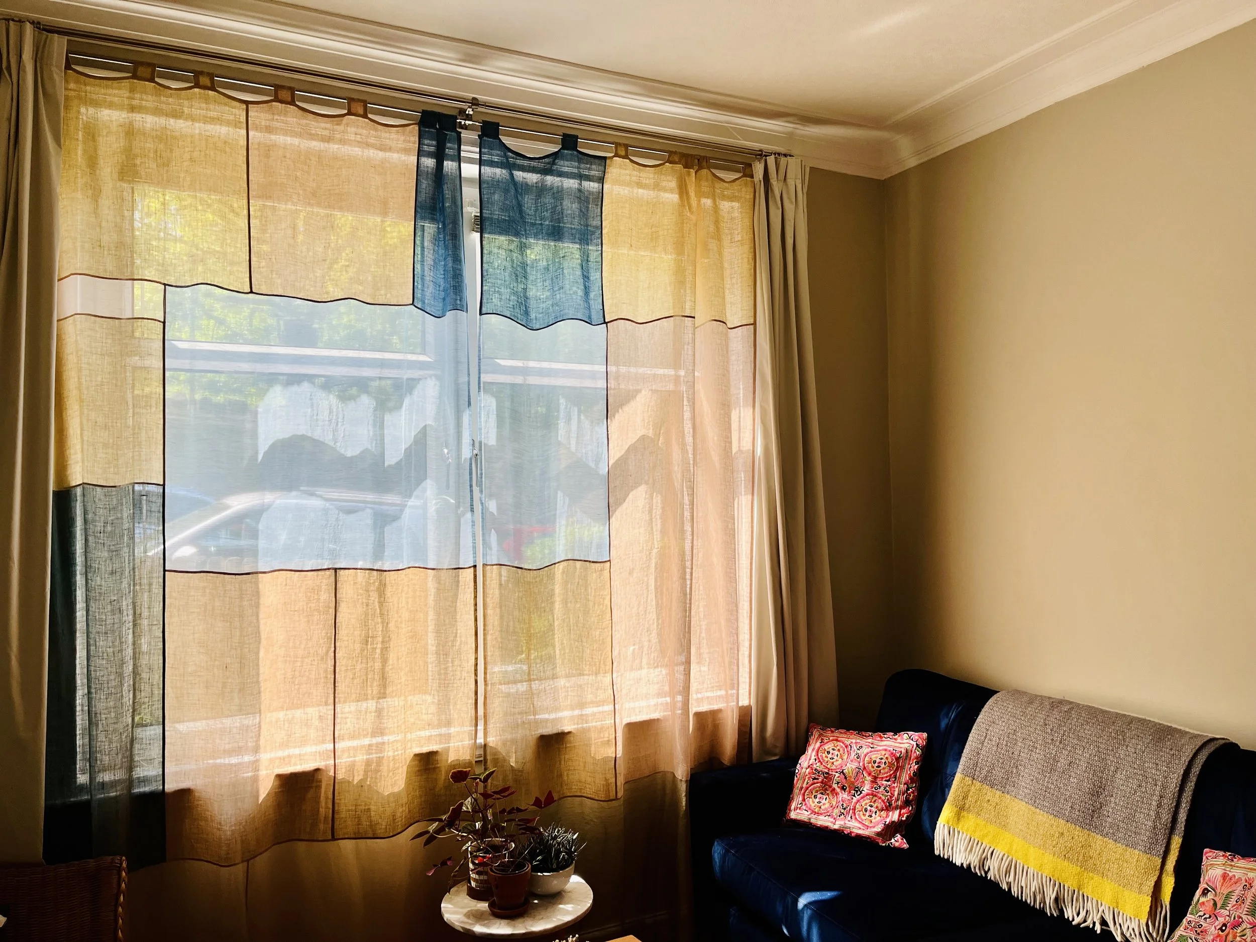 Custom linen, silk/ linen and organic cotton privacy curtains dyed with indigo, gorse, avocado, oak gall and eucalyptus. Printed with natural dye inks. Pieced and inspired by Korean bojagi.