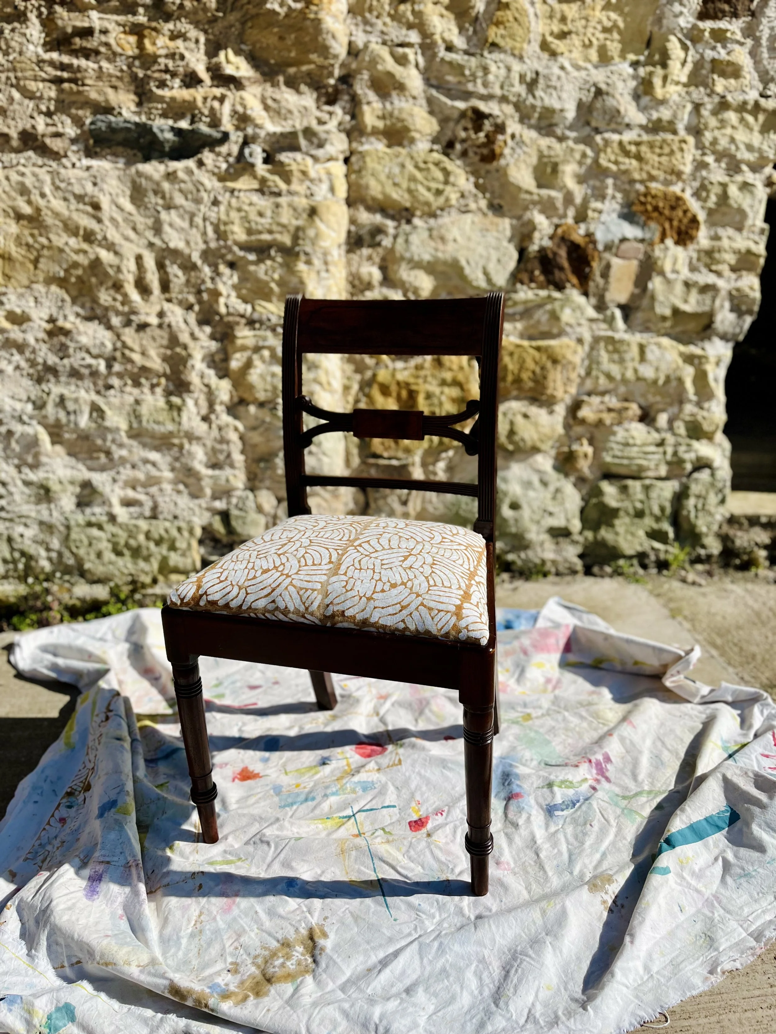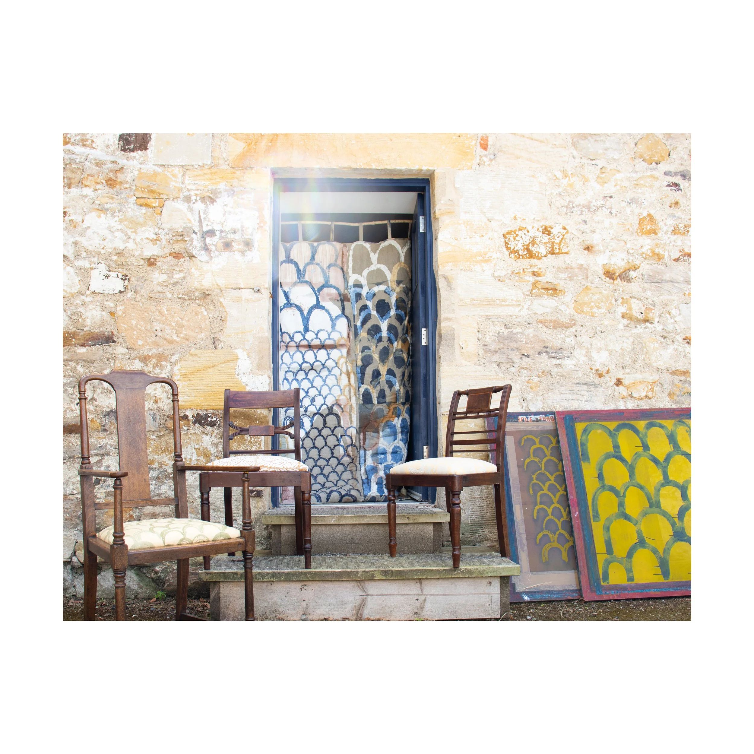 Custom linen and organic cotton curtain pieced using synthetically dye printed archival remnants and natural dyed fragments including iron, red cabbage and gorse.